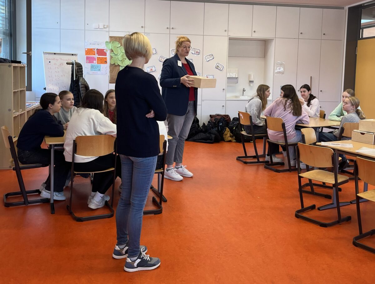 Nach einer kurzen Einführung erkundeten die 12- bis 13-Jährigen in Kleingruppen die vier Stationen ihrer Lernkisten. An einer Station analysierten sie mittels Rätselkarten und Wimmelbildern, wie regionale Lebensmittel lokale Wertschöpfungsketten stärken und CO₂ sparen. Anschließend konnte der eigene ökologische Fußabdruck ermittelt werden. Besonders lebhaft diskutiert wurde der „Burger der Zukunft“: Die Jugendlichen kombinierten innovative Ansätze wie „Urban Gardening“ oder Insekten als Proteinquelle – und staunten über ungewohnte Perspektiven. Neben der nachhaltigen Erzeugung und der regionalen und saisonalen Auswahl von Lebensmitteln ging es auch um den wertschätzenden Umgang mit Lebensmitteln.