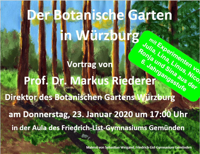 Am 23. Januar 2020 hielt Herr Prof. Dr. Markus Riederer in der Aula des Friedrich-List-Gymnasiums einen Vortrag im Rahmen der Jubiläumsreihe „50 Jahre FLG“ zum Thema „Der Botanische Garten in Würzburg“.