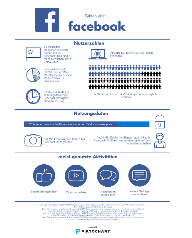 Facebook ist wohl das größte soziale Netzwerk der Welt – 1,4 Milliarden Menschen weltweit nutzen die Plattform täglich. Aber warum loggen wir uns täglich auf Facebook ein? Der wohl wichtigste Grund weshalb wir soziale Netzwerke und insbesondere Facebook nutzen ist, dass wir mit unseren Freunden kommunizieren wollen. Häufig nutzen wir Facebook auch, weil unsere Freunde es tun, wir wollen also zu einer bestimmten Gruppe dazugehören und mitsprechen können. Wir verwenden Facebook aber auch zur Informationssuche, was macht beispielsweise meine Lieblingsband? Oder welche Mode ist momentan aktuell? Wir informieren uns also online über Themen die uns interessieren und greifen diese dann offline wieder auf, indem wir mit unseren Freunden darüber reden. Facebook erleichtert uns aber nicht nur die Informationssuche, sondern auch neue Freunde direkt besser kennenzulernen. So brauchen wir nur einen Klick auf das Profil zu machen und schon sehen wir alle wichtigen Informationen auf einen Blick. Dass nicht fremde Personen auf euer Profil zugreifen können, ist es wichtig eure Privatsphäre richtig einzustellen. Weitere Informationen dazu findet ihr unter dem Punkt „Privatsphäre Facebook“.