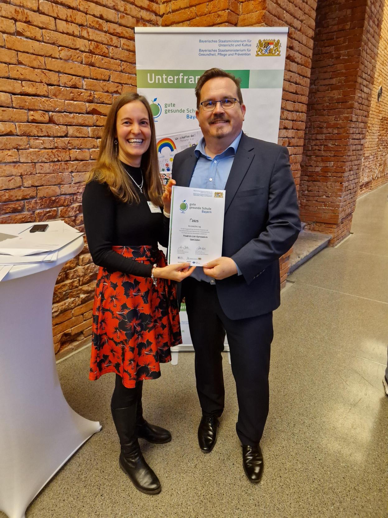 Hinter dem Prädikat steht das Landesprogramm „Gute gesunde Schule Bayern“, getragen vom Kultus- und Gesundheitsministerium, dem Zentrum für Prävention und Gesundheitsförderung (ZPG) am Landesamt für Gesundheit und Lebensmittelsicherheit (LGL) sowie mehreren Partnern aus den Bereichen Gesundheitswesen und Unfallversicherung. Nur wenige Schulen in ganz Bayern dürfen sich über den dauerhaften Sonderstatus freuen. Das Friedrich-List-Gymnasium gehört nun als eine von drei unterfränkischen Schulen dazu.
