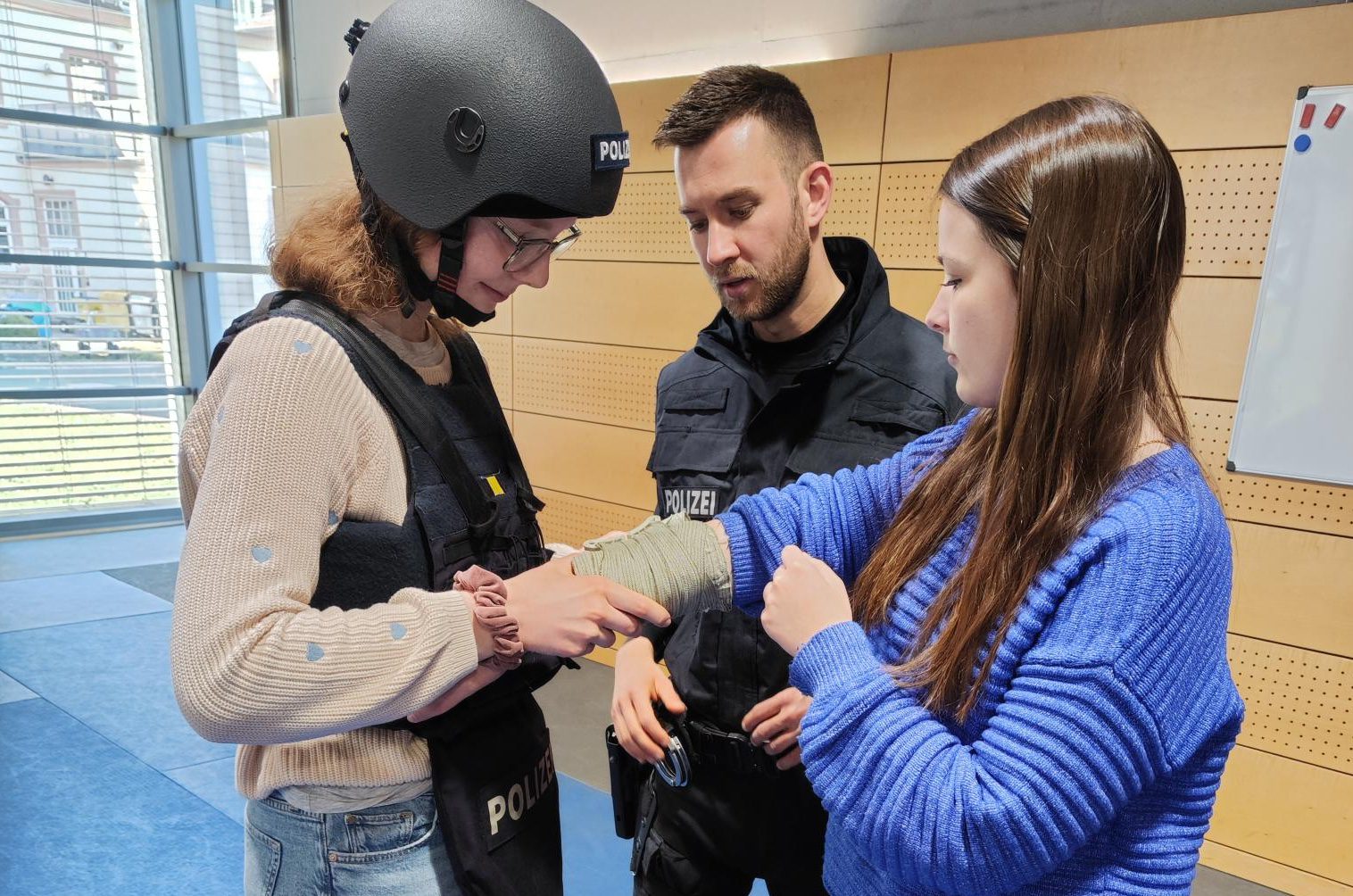 Ein weiterer Schwerpunkt lag auf der praktischen Erste-Hilfe-Ausbildung, die auch für Polizeibeamte natürlich unerlässlich ist. Die Schülerinnen und Schüler lernten nicht nur das klassische C-ABCDE-Schema, sondern erhielten Erläuterungen und praktische Anleitungen zum Anlegen einer Trauma-Bandage sowie im Umgang mit dem Tourniquet – einem Hilfsmittel zum Abbinden stark blutender Wunden. Auch das Ausprobieren eines Tragetuchs gehörte zu den praktischen Übungen, die die Schüler interessiert und mit Spaß angingen.