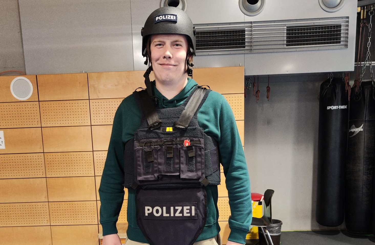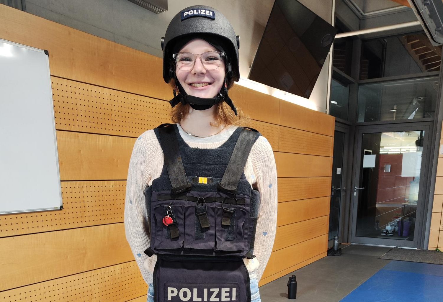 Um die physischen Anforderungen des Berufs der Polizeibeamtin bzw. des Polizeibeamten zu verdeutlichen, hatten die Jugendlichen die Möglichkeit, Sicherheitskleidung auszuprobieren, einschließlich verschiedener Schutzwesten und Helme, die in Summe ein imposantes Gewicht hatten.