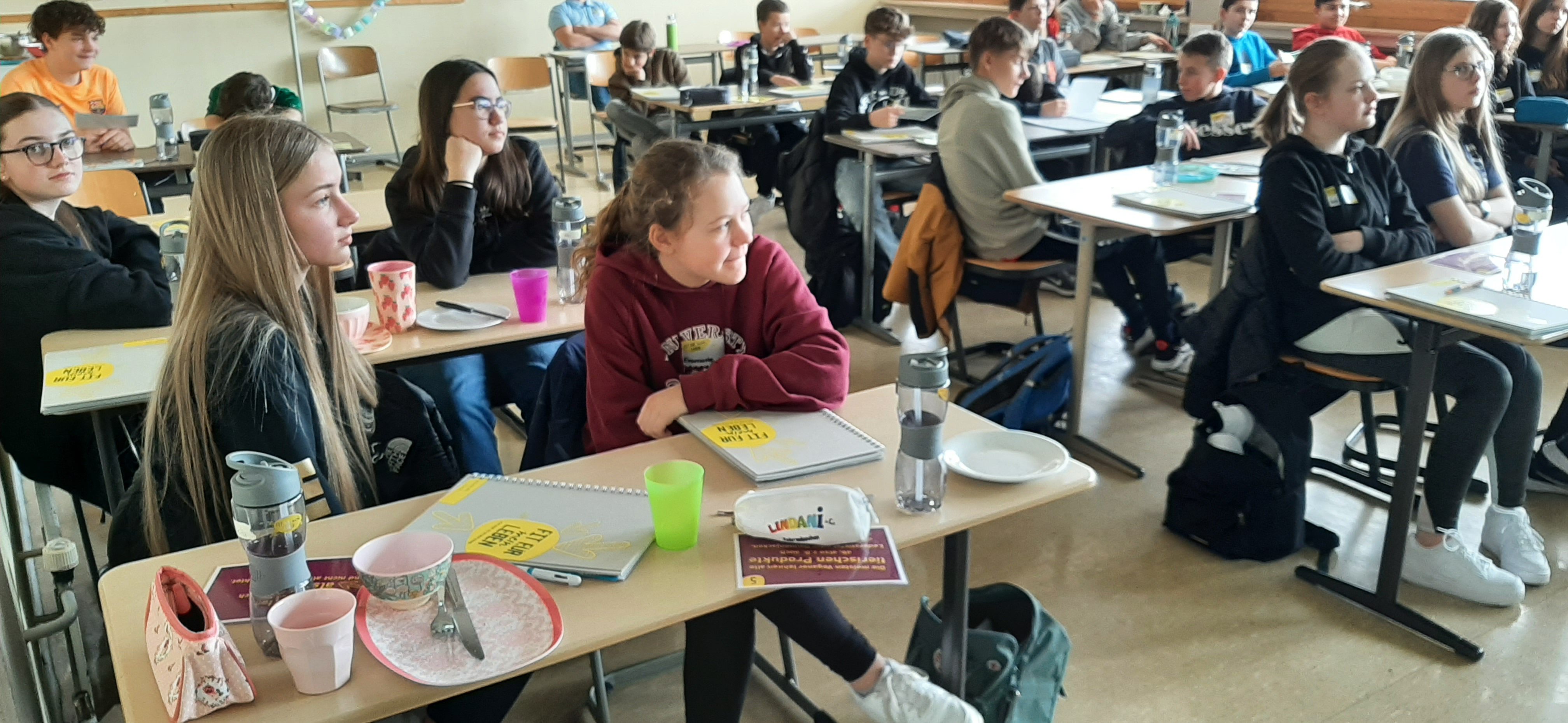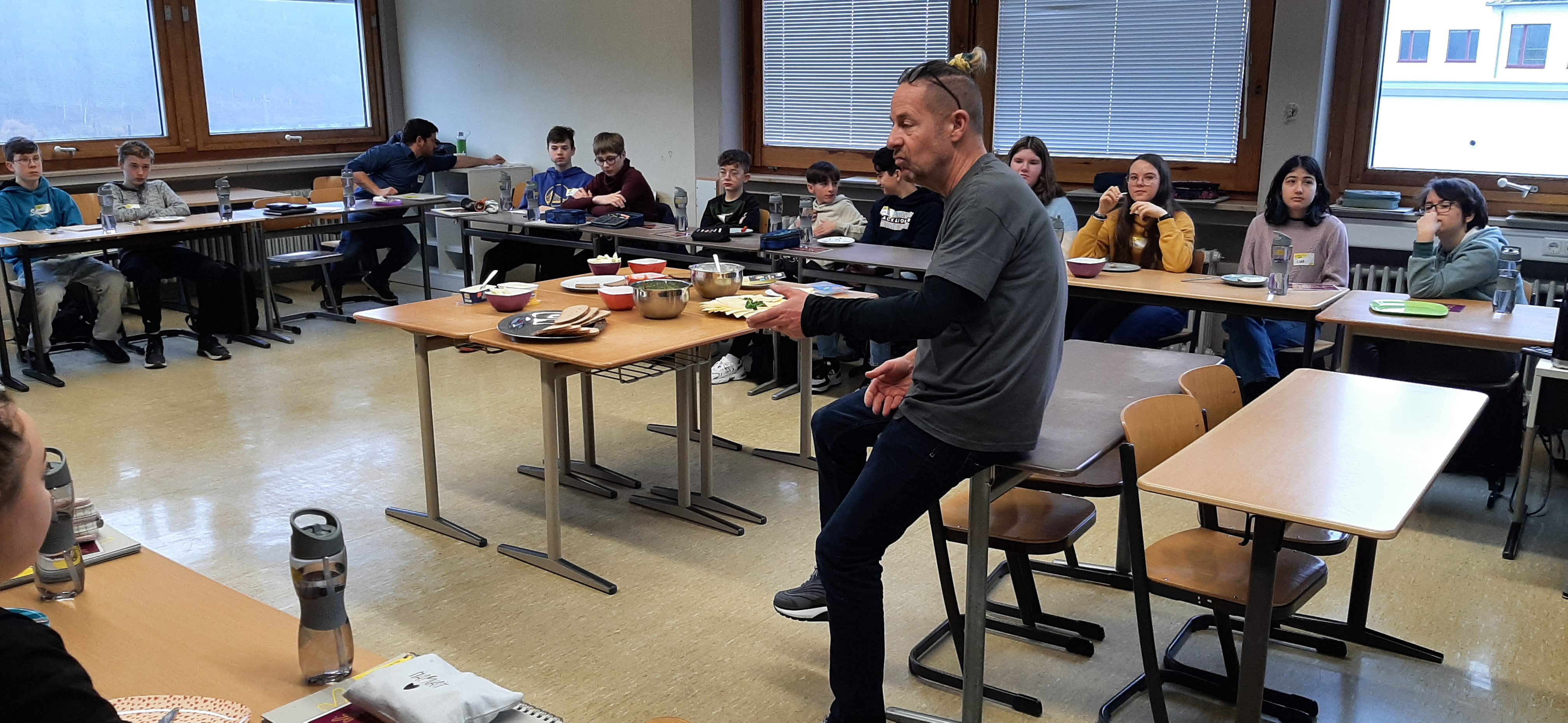 Der dritte Zeitreisende im Bunde, Sebastian Leisgang, hat seinen Traumjob als Journalist bereits als 15-Jähriger während eines Schulpraktikums bei einer Lokalzeitung gefunden. Nach einem Studium der Medienkommunikation in Würzburg arbeitet Leisgang mittlerweile als Sportredakteur unter anderem für die Süddeutsche Zeitung und den Kicker, wobei er auch mit seinem Podcast „Immer die drei“ spannende Einblicke in die Fußballwelt liefert. Den vierten und letzten Vortrag hielt Dennis Imhof, der aufzeigte, dass sich Abitur und Ausbildung nicht ausschließen: Nach dem Studium der Wirtschaftswissenschaften in Würzburg und München absolvierte er noch eine zweijährige Ausbildung als Koch, um neben der theoretischen Ausbildung auch voll in die Praxis einzutauchen, ehe er in der dritten Familiengeneration in die Leitung im Hotel Imhof einstieg.