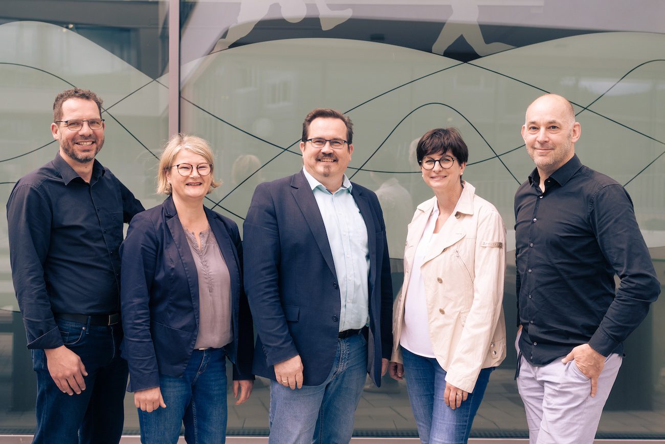 Die Schulleitung am FLG (v.l.n.r.): StD Andreas Raps (Erweiterte Schulleitung), StDin Sabine Cramer-Deeg (Erweiterte Schulleitung), OStD Ingo Schneider (Schulleiter), StDin Dr. Eleonore Hose (Erweiterte Schulleitung), StD Lars Michel (Stellvertretender Schulleiter).