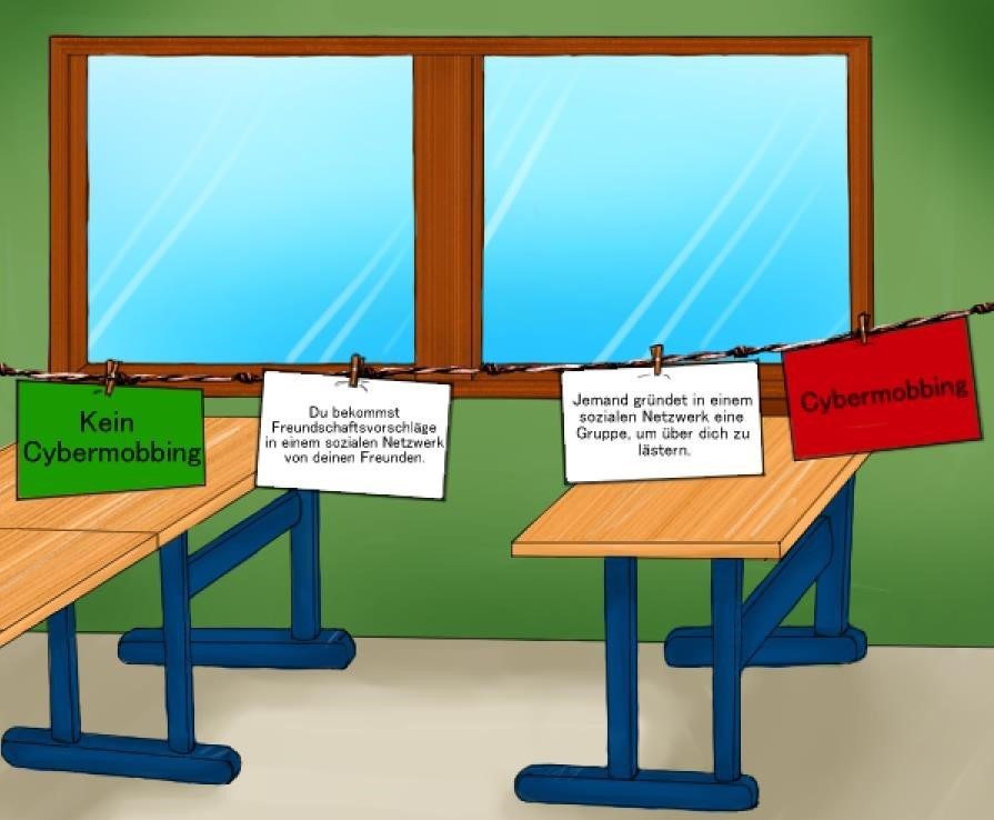 Täters per moderner Netzwerke, meist über einen längeren Zeitraum.“ Danach erklärten wir, wer die Mitwirkenden beim Cybermobbing sind. Das ist zum einen der Täter, dieser mobbt das Opfer, das Opfer, welches vom Täter gemobbt wird und oftmals ein Mitwirkender, der dem Täter beisteht. Nachdem wir das alles mit den Kindern besprochen hatten, haben wir ein kleines Spiel gemacht, dies hieß „Cybermobbing-Wäscheleine“, dabei mussten die Schüler Karten mit Fällen zuordnen, ob es Cybermobbing ist der nicht.