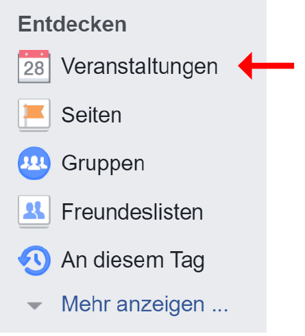 - Links siehst du nun eine Spalte. Klicke unter dem Punkt „Entdecken“ auf den Link „Veranstaltungen“.
