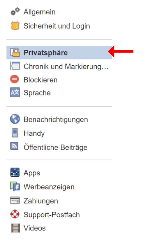 - Links siehst du nun verschiedene Einstellungen. Klicke auf „Privatsphäre“